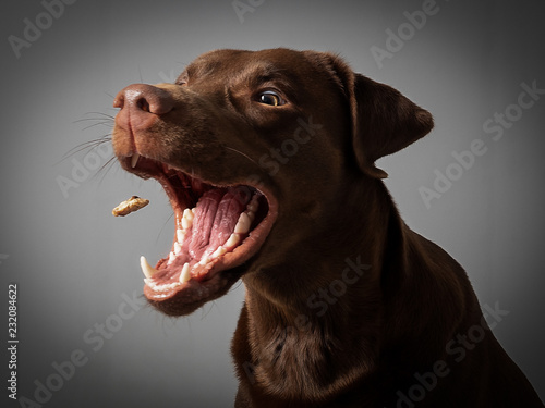 Hund Labrador Braun Fangt Leckerlie Keks In Der Luft Und Schnappt Danach Vor Grauem Hintergrund Stock Photo Adobe Stock